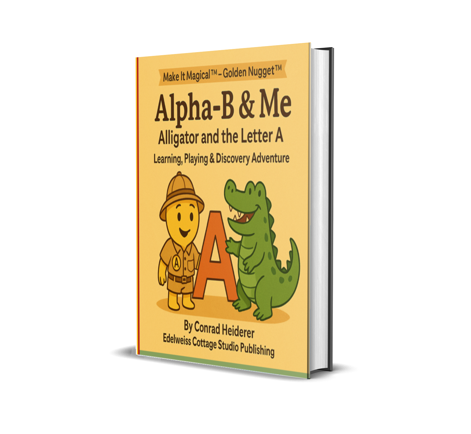 Welcome to Alpha-B & Me — Alligator and the Letter A, the first magical adventure in a groundbreaking new early development series by visionary author and creative educator Conrad Heiderer. This book is part of the Make It Magical™ – Golden Nugget™ learning initiative, designed to plant the early seeds of literacy, creativity, and self-discovery in young minds—through playful interaction, intentional simplicity, and meaningful connection between child and parent.